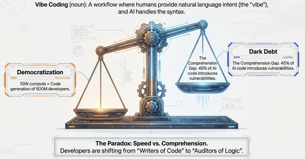 - The Comprehension Gap: When an AI generates 90% of the code or even 100% of it, the human developer often loses track of how the system works. This leads to “Dark Debt”—hidden complexity and bugs that no one understands and that only surface months later. A project might work perfectly for the demo, but when a specific edge case arises in production, the “vibe coder” has no idea where to look in the thousands of lines of machine-generated code. Of course, this is being addressed with AI code reviewers, but the underlying lack of human understanding and comprehension remains. The key paradox here is the loss of interpretability.